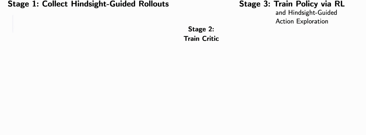 HOPE integrates hindsight-guided exploration into both stages of actor critic RL.