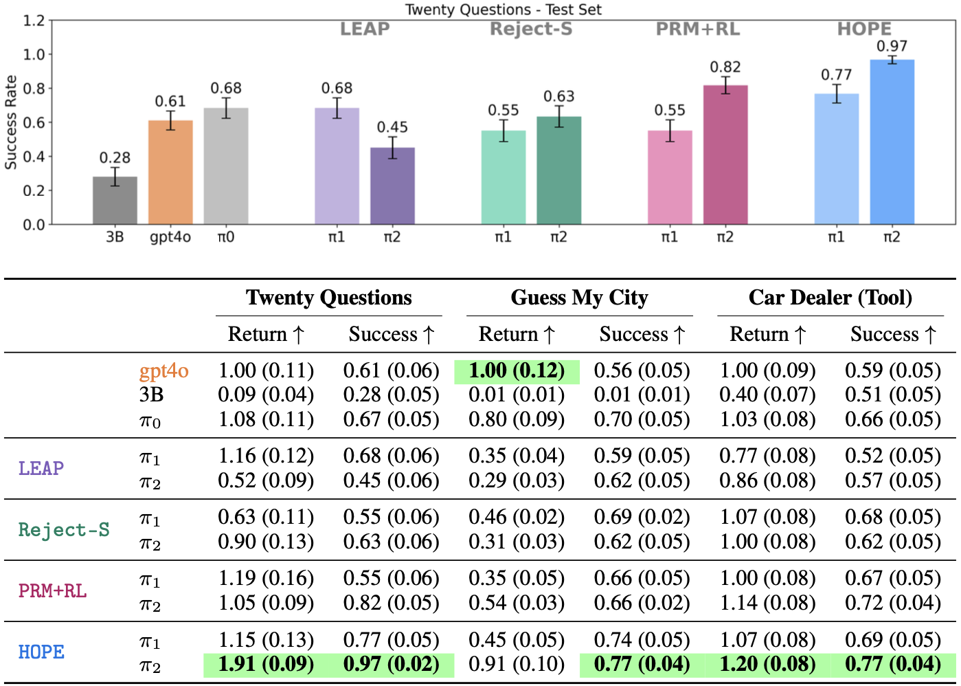 Below we report average success rate and normalized return (with respect to gpt4o).